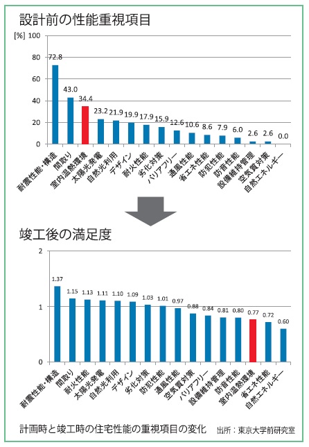 住まいの断熱性能は、国が定める省エネ基準レベルでは十分ではないことは以前触れたとおりだ。図は、東京大学の前真之准教授による消費者が新築する際にこだわる性能の項目に関する調査結果だ。計画段階では室内温熱環境(主に断熱性能)にこだわる人は少ないが、引っ越した後にそれを不満足項目としてあげる人が多いという。後悔しない住まいづくりのためには、できれば国の基準を超える断熱性能を確保したいものだ。その上で余裕があれば、ぜひスマートハウス化も検討したい。