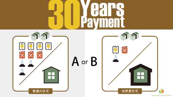 その条件とは、「イニシャル+ランニングコスト」という定義。A、Bのどちらも「イニシャルコスト(最初にお家を建てるときの金額)」+「ランニングコスト(30年間で生活の上で必要な電気、ガスの総額)」、この2つを合わせた総額が、「AでもBでも一緒である」、つまりトータルの支払額は変わらないという条件をつけるだけ。つまり、イニシャルが安くても、ランニングコストで後払いが増え、初期投資が高くてもあとのランニングコストが安ければ、どちらでも「30年後のトータルコストは一緒になる」ということ。それを「エネルギーパス」で提示するだけです。