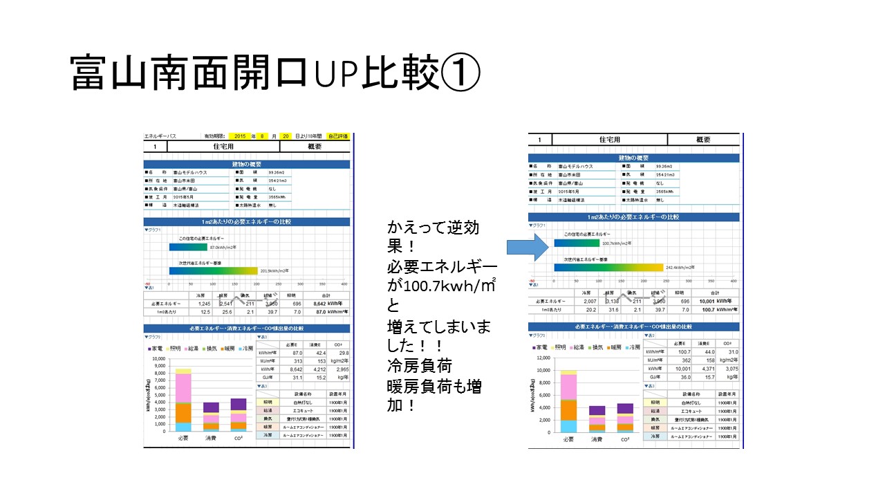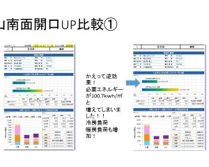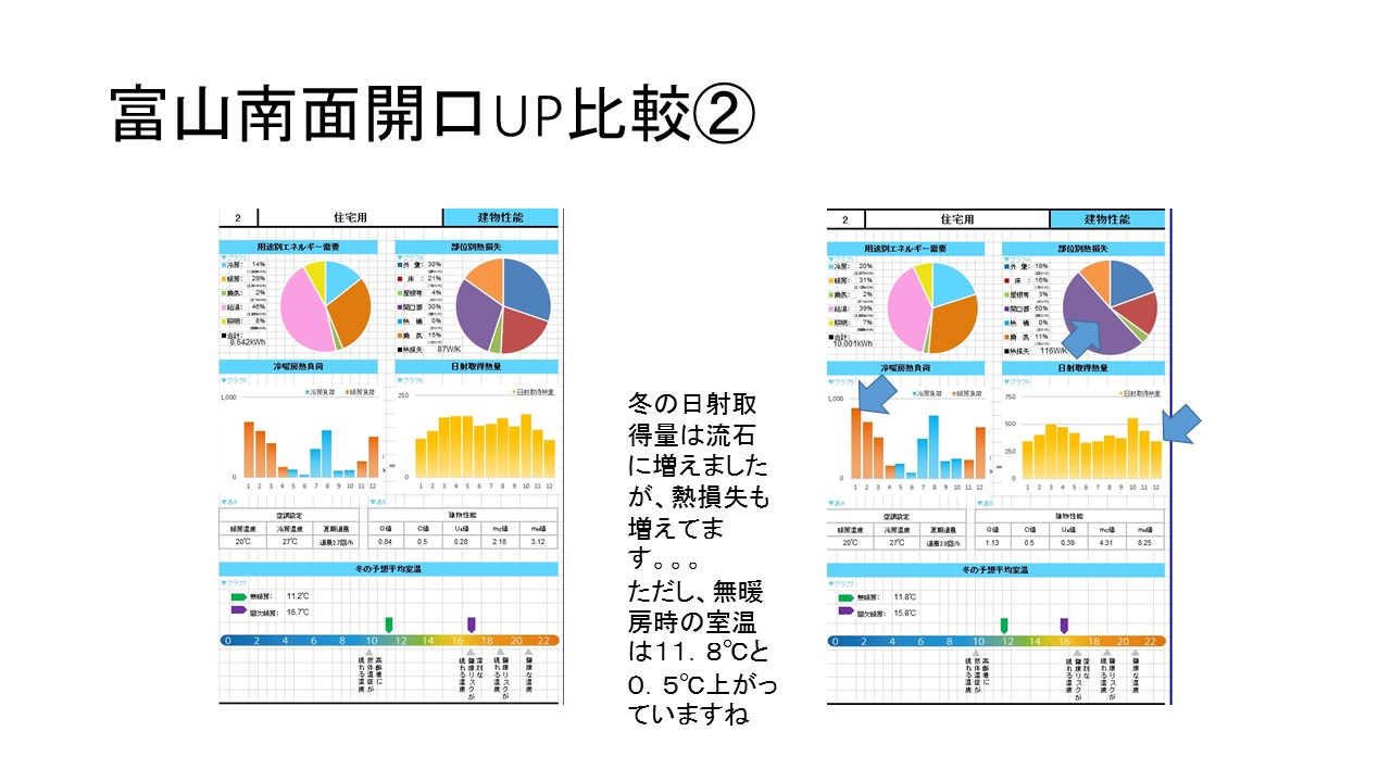 確かに南面開口を増やしましたので冬場の日射取得は増えましたが、それ以上に開口部の熱損失が増えているのです。